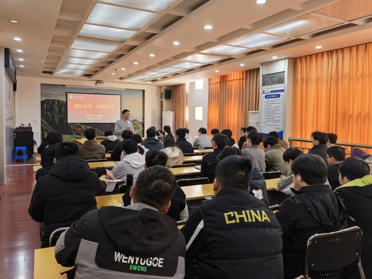 为引导毕业生树立诚信意识,提升职场竞争力,12月8日,机械电子工程学院在鼎新楼2200会议室成功举办以“诚信立身,扬帆职场”为主题的就业育人活动。本次活动由机电学院就业科长张陆和2026届毕业班辅导员杨芳老师共同主持,70余位即将步入职场的2026届毕业生积极参与,现场氛围热烈而有序。