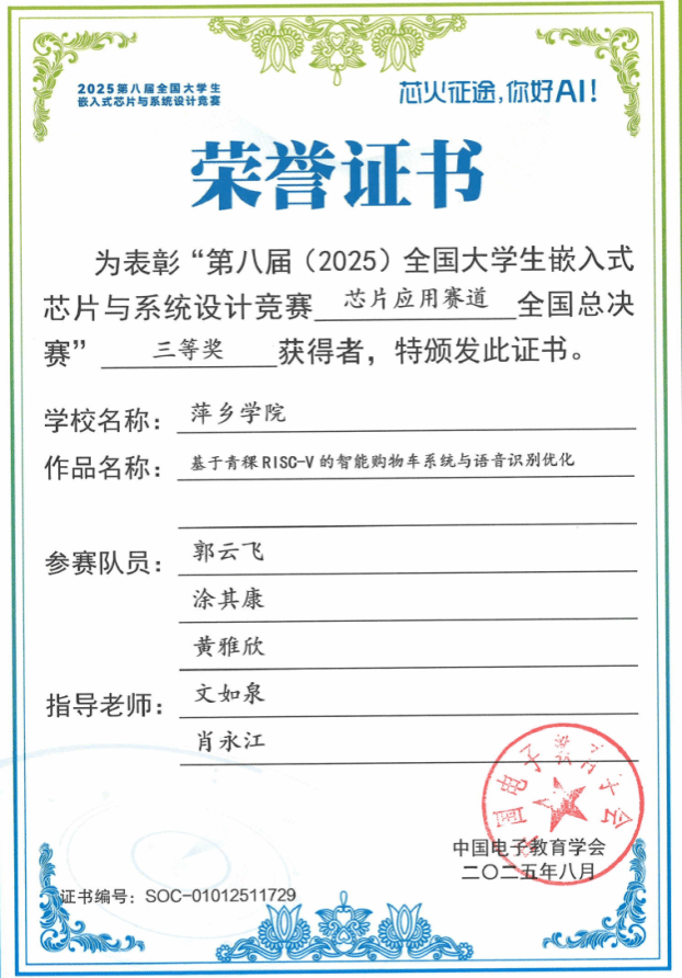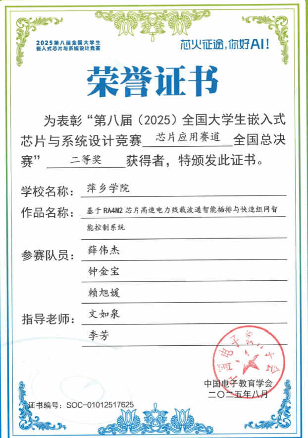 近日,第二十届全国大学生嵌入式芯片与系统设计大赛全国总决赛圆满落幕。经过激烈角逐,由机械电子工程学院薛伟杰、钟金宝、赖旭媛等同学组成的参赛队伍(指导教师:文如泉、李芳),其参赛作品《基于 RA4M2 芯片高速电力线载波通智能插排与快速组网智能控制系统》凭借创新的设计理念、扎实的技术功底和出色的现场表现,在全国众多顶尖高校的优秀作品中脱颖而出,荣获全国总决赛二等奖的优异成绩。郭云飞、涂其康、黄雅欣等同学组成的参赛队伍(指导教师:文如泉、肖永江),其参赛作品《基于青稞 RISC-V 的智能购物车系统与语音识别优化》凭借其前瞻性的硬件架构设计、高效的语音识别算法,在全国众多顶尖高校的优秀作品中脱颖而出,荣获全国总决赛三等奖的优异成绩。