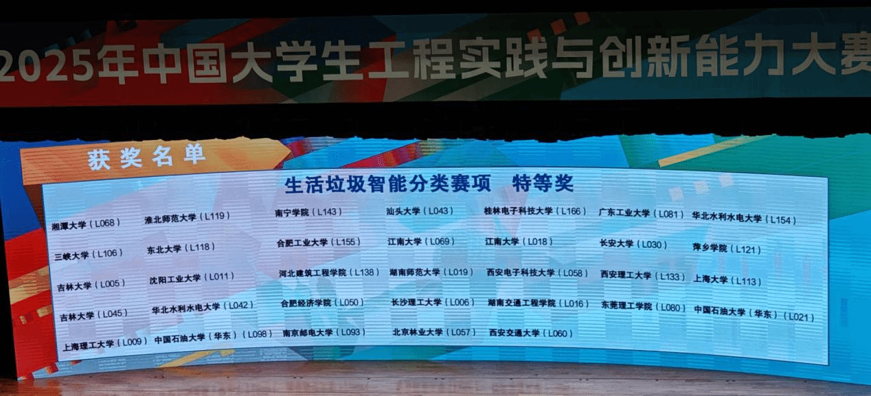 本届大赛以“交叉融合工程创新育新质,立德树人强国建设勇担当”为主题,采用校赛、省赛、国赛三级选拔机制,涵盖“新能源车”、“智能+”、“虚拟仿真”三个赛道共九个赛项,涉及基础工程设计、人工智能赋能的机电综合系统设计、重大装备设计、工程管理与决策、数字化新媒体等多个领域。比赛强调现场实践与工程特色,所有参赛队伍需进行现场调试、运行与实物展示,真正考验选手的综合创新与动手能力。自2024年10月起,机械电子工程学院在学校领导的关怀和创新创业学院的大力支持下,积极宣传、动员并组织学生备赛。经过近一年的刻苦训练和多轮比拼,学院两支参赛团队在省赛中脱颖而出,成功晋级全国总决赛并取得优异成绩。垃圾智能分类团队(熊铠、梅军伟、赖泽祥、钟金宝)以全省第一的成绩晋级全国总决赛,最终斩获全国特等奖。智能物流搬运团队(曹宇扬、骆耀劲、熊盼盼、李也平)以全省第五的成绩晋级全国总决赛,最终荣获全国二等奖。