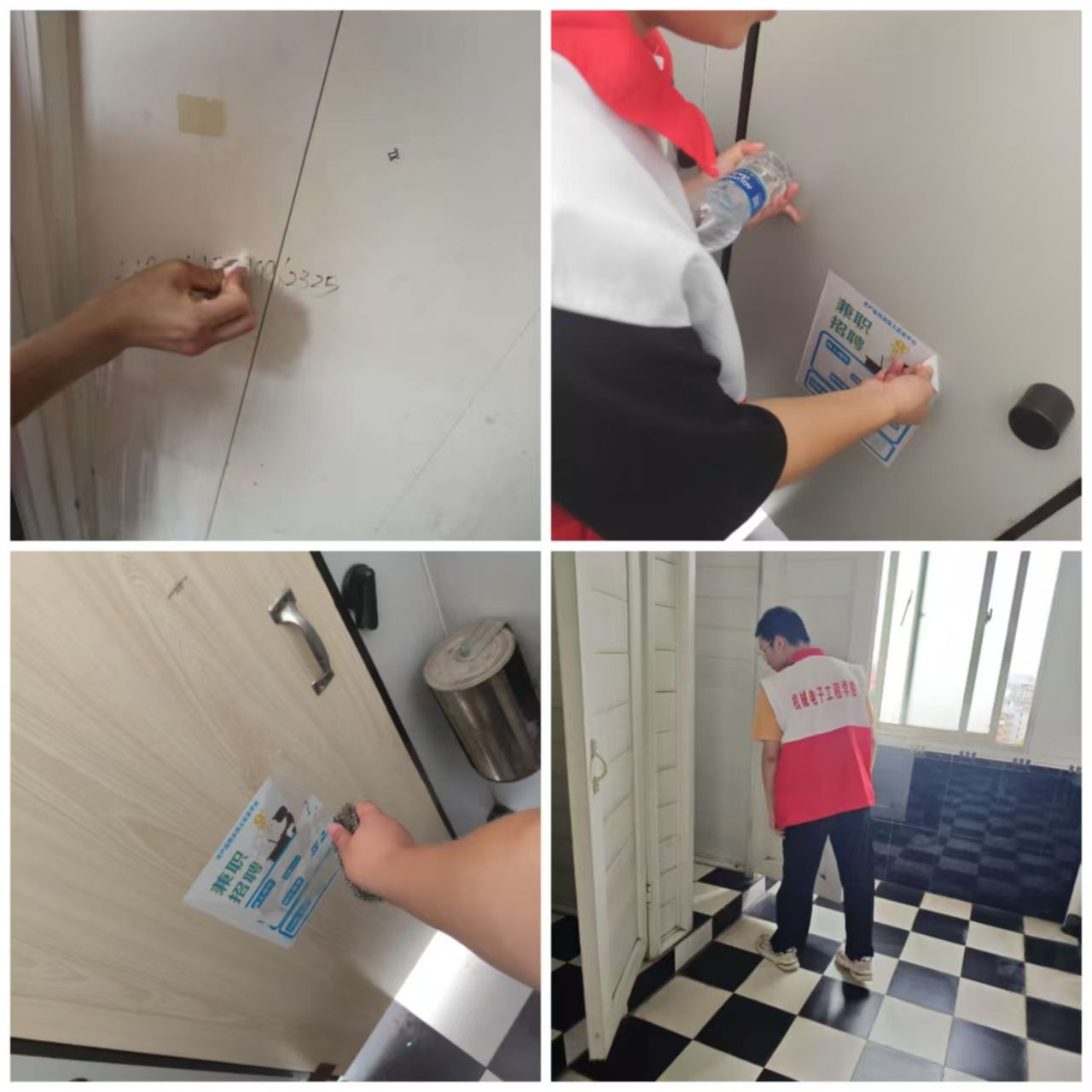 活动中,学生党支部成员和青年志愿者协会的同学们分成多个小组,坚持以“看见一处,清理一处”为原则,以高度的责任感投入工作,对鼎新楼、格致楼、天泉楼的公共区域进行了全面排查和清理。大家手持铲子、清洁剂等工具,仔细清除墙面、门窗上的非法小广告及不当标语,并对带有二维码的违规张贴物进行了重点清理,真正做到不留死角,不留盲区。在清理过程中,同学们还主动向过往师生宣传爱护校园环境的理念,呼吁共同抵制非法张贴行为,共同维护校园的整洁与文明。