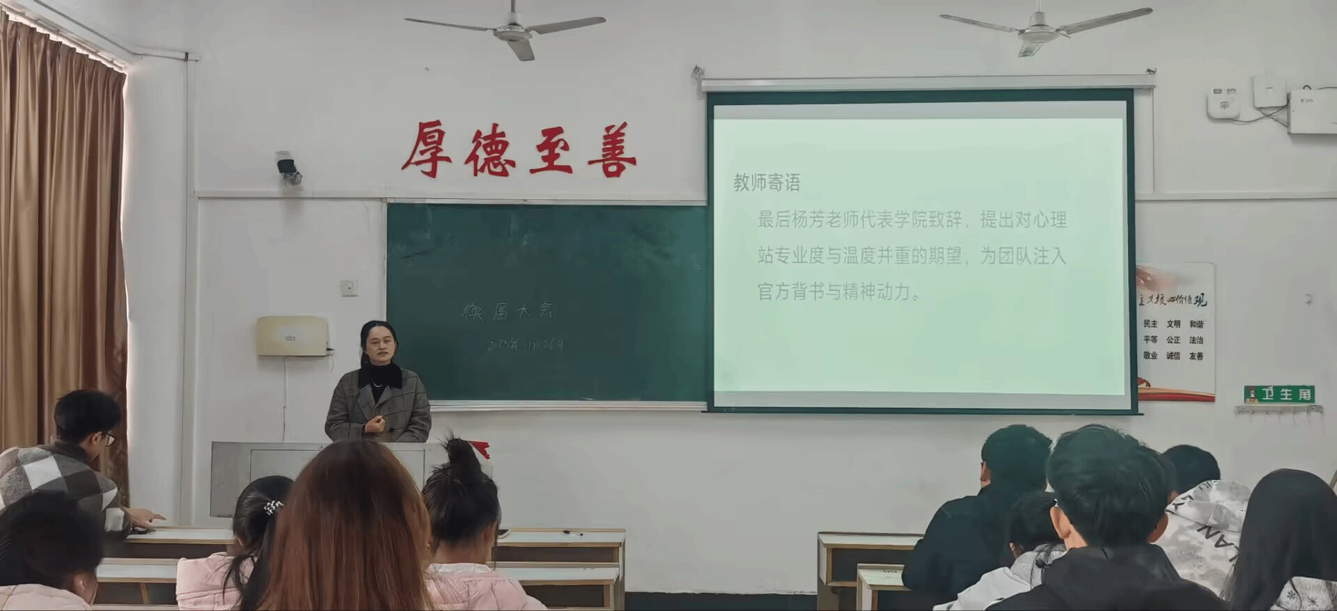 11月26日中午,机械电子工程学院心理工作站在2216教室隆重举行换届大会,心理站指导老师杨芳及心理站全体成员齐聚现场,共同见证这一重要时刻。
